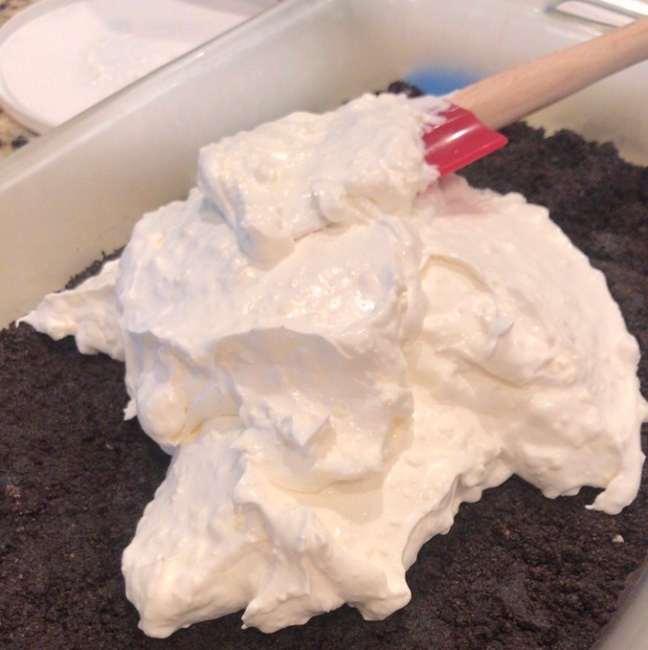 5. Spread cream cheese mixture over Oreo cookie crush. Put the dish back in the fridge and let it chill for 10 minutes.