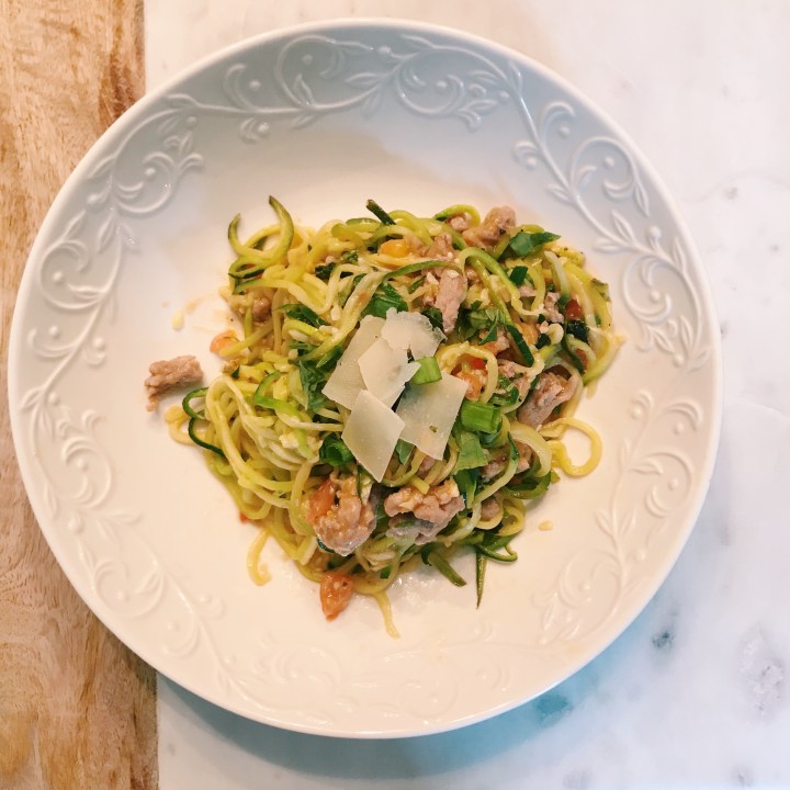 I’m always on the lookout for healthy recipes, especially if they involve zucchini noodles. Sometimes it’s hard to find items that aren’t totally bland, but I was pleasantly surprised by this zoodle dish.