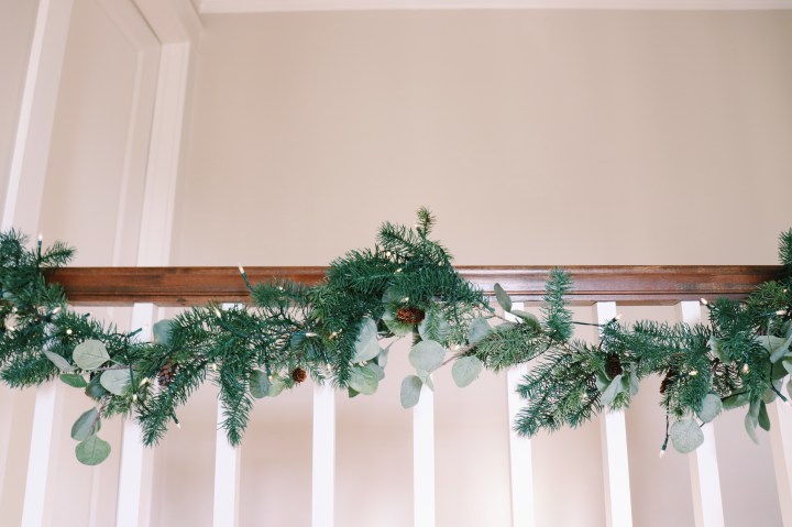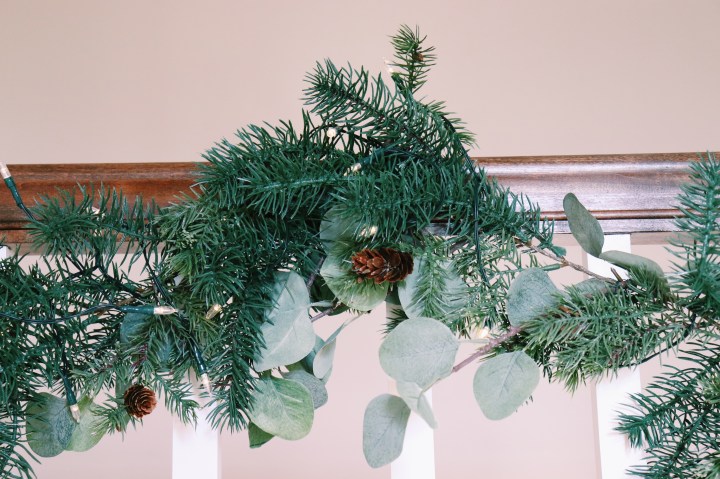 Now, for the next step: Christmas lights. Personally, since I used the battery-operated lights, I chose to hang my garland on the stairs before attaching the lights. You can do it my way, or you can wrap the lights around before you hang the garland. Either way, the finished product will look fabulous.