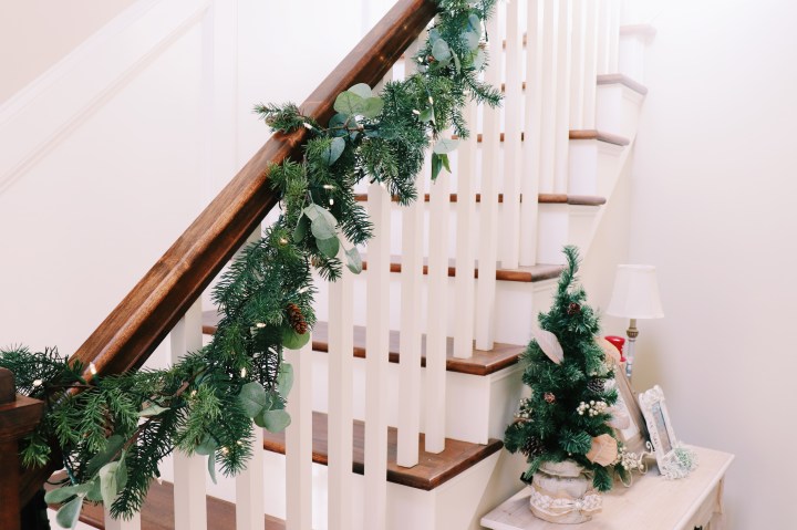 This is our second holiday season in our home, and I’m going all out this year – starting with garland for my staircase. In an effort to save a little money, I turned to some good ole’ DIY methods. [Going all out because next year we’ll have a crawling baby!]