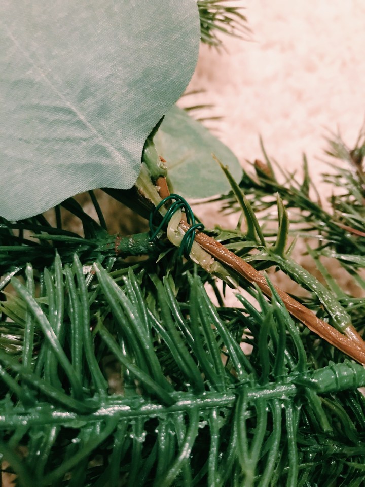 - Attach the eucalyptus pieces to the garland. Tie in place using the garden wire.