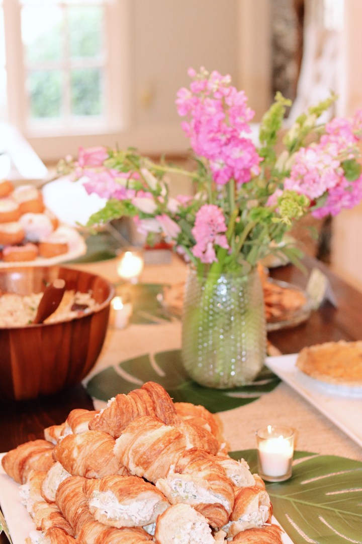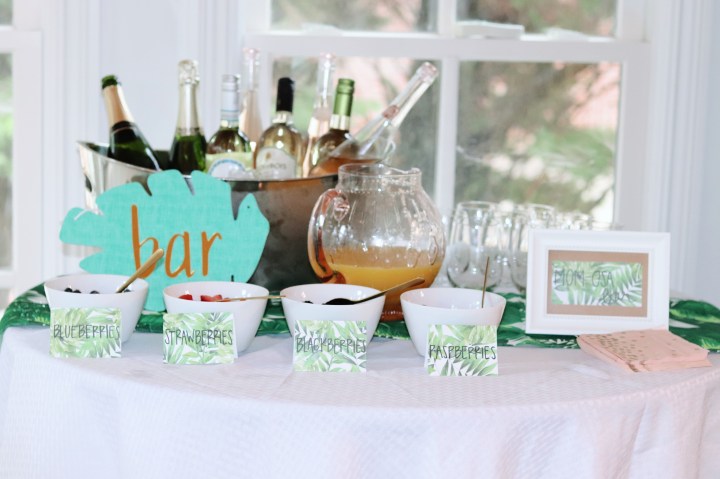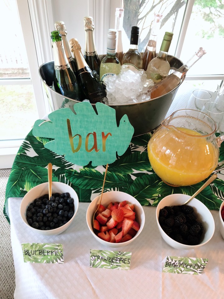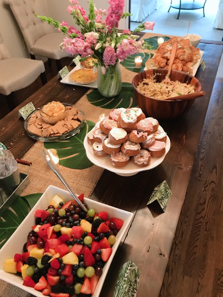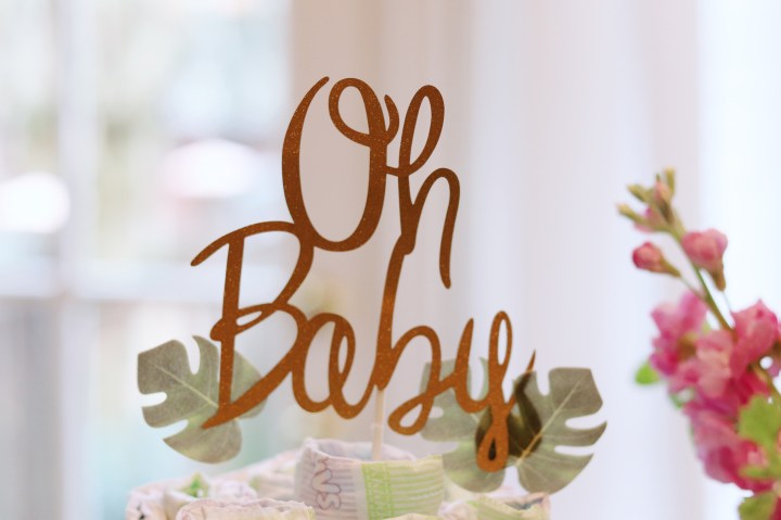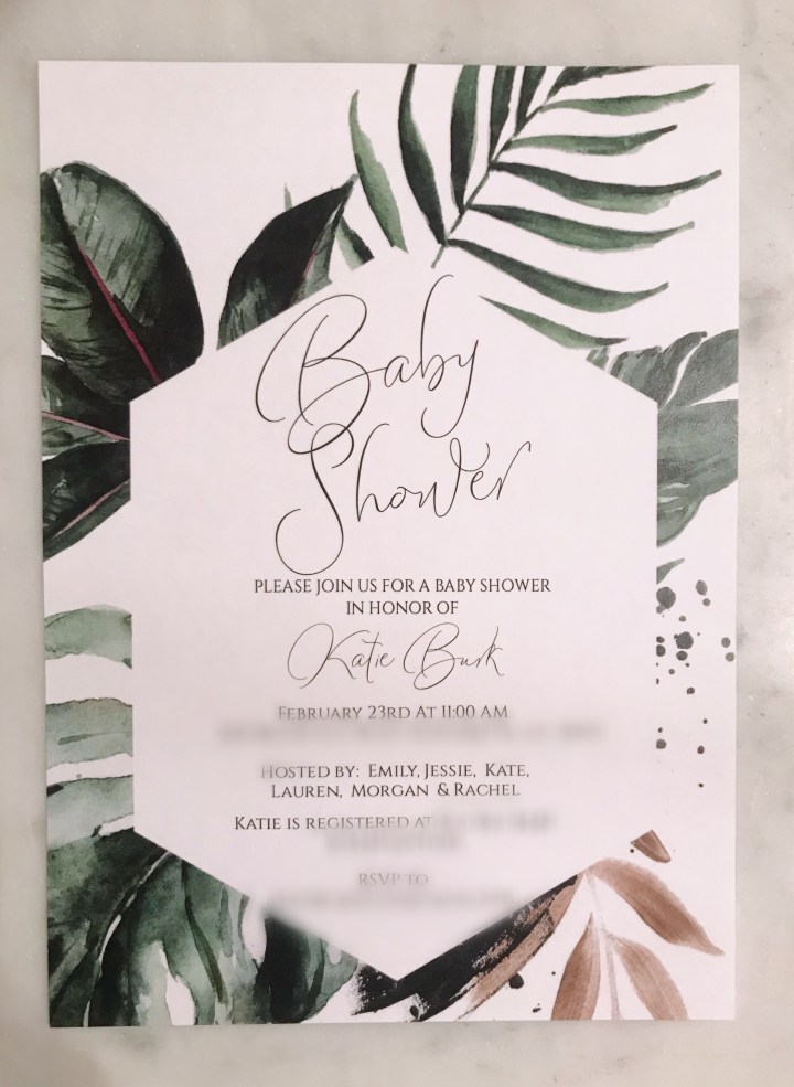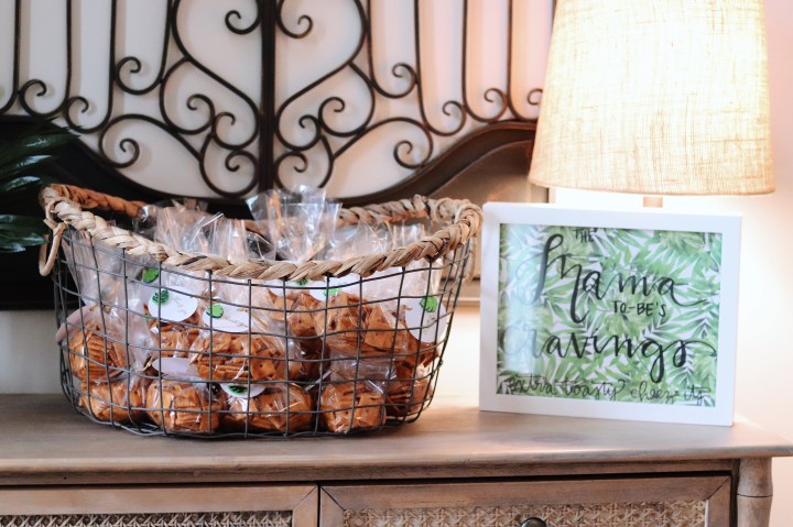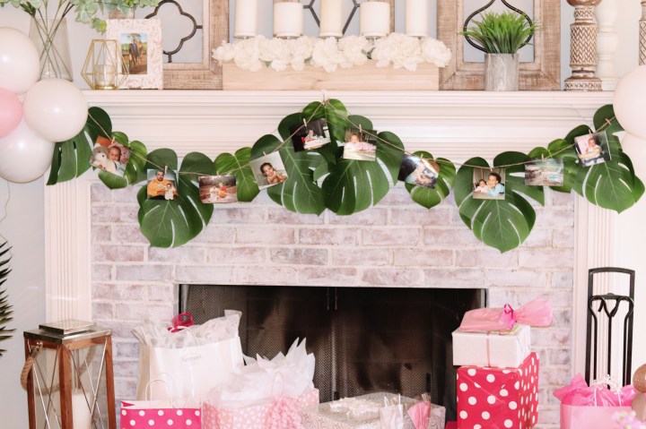 The theme was palm leaves and everything turned out so perfect. From the “momosa” bar to a leafy photo banner over the fireplace, a stunning diaper cake, to miniature palm trees scattered throughout the house, an incredible food spread, and a beautiful balloon arch – I could go on and on! [Fun fact: The shower was held at Rachel‘s house & we’ve been friends since 1995… #BFF4L]