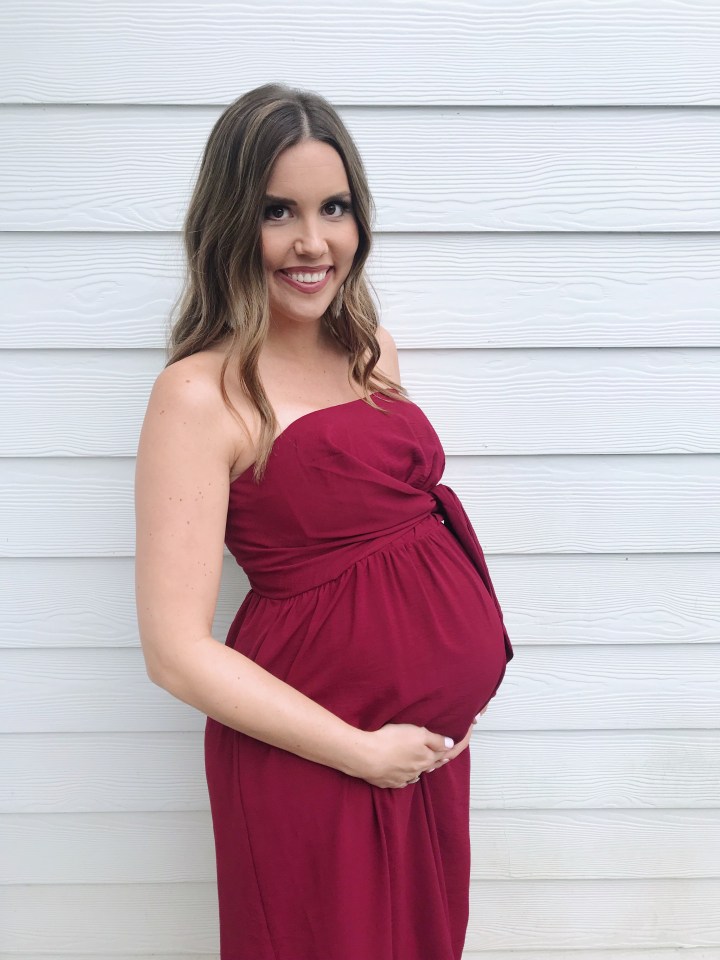 My outfit details: Dress: Pink Blush Maternity | Shoes: Target | Slippers: Victoria’s Secret | Earrings: Amazon | Bump: My husband 🙂