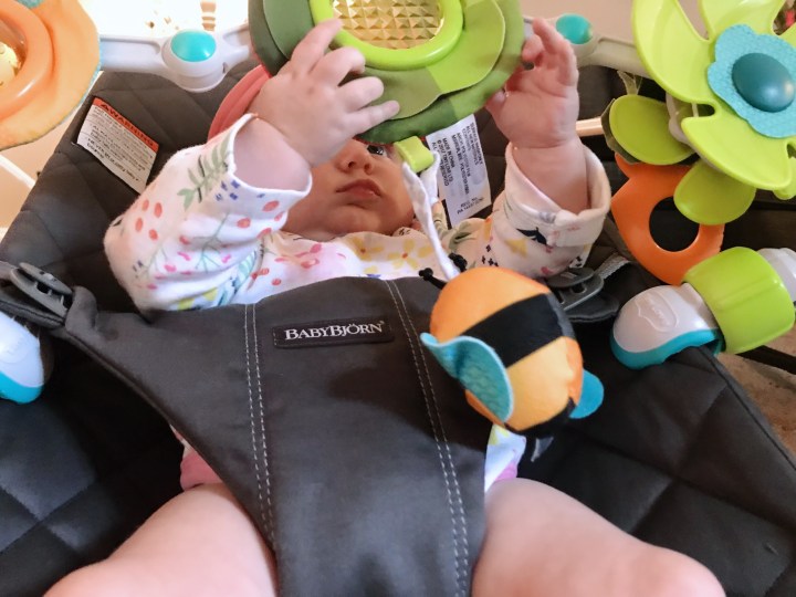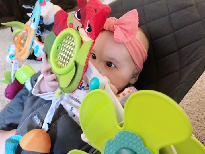 First up, the Tiny Love Meadow Days Sunny Stroller Arch. This thing is awesome, y’all. [Thanks to my friends Katelyn and Kate for recommending.] It easily attaches to bouncers, sit-up chairs, strollers, bassinets, car seats, you name it. The toys on it are perfect for hand-eye coordination, and it helps them gradually learn to control their hands.