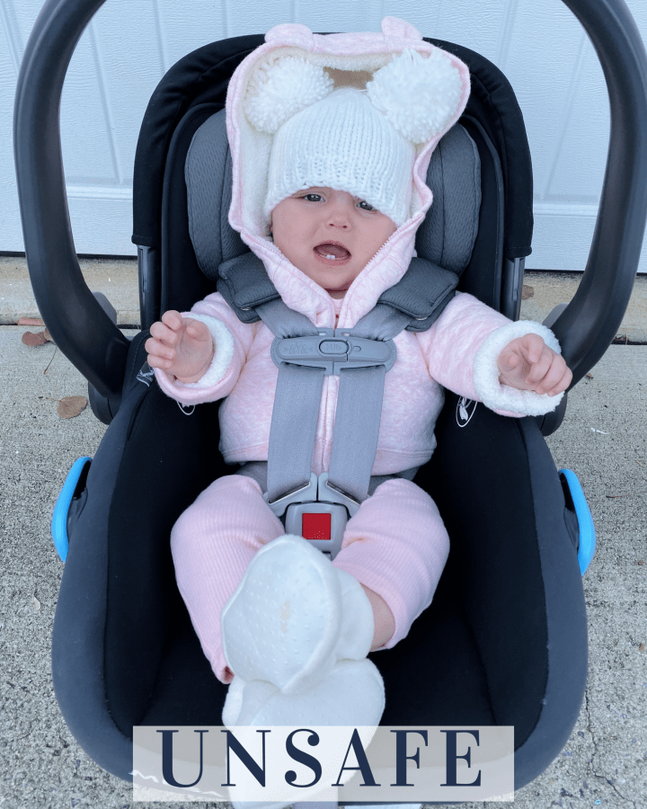 I immediately turned to Google to confirm what my followers were telling me, and I felt like the biggest dumbass. According to the National Highway Traffic Safety Administration (NHTSA), too much bulk can create extra room in the harness, causing a loose fit. If you were to get into a car wreck, you’d be putting your child at risk of getting hurt.